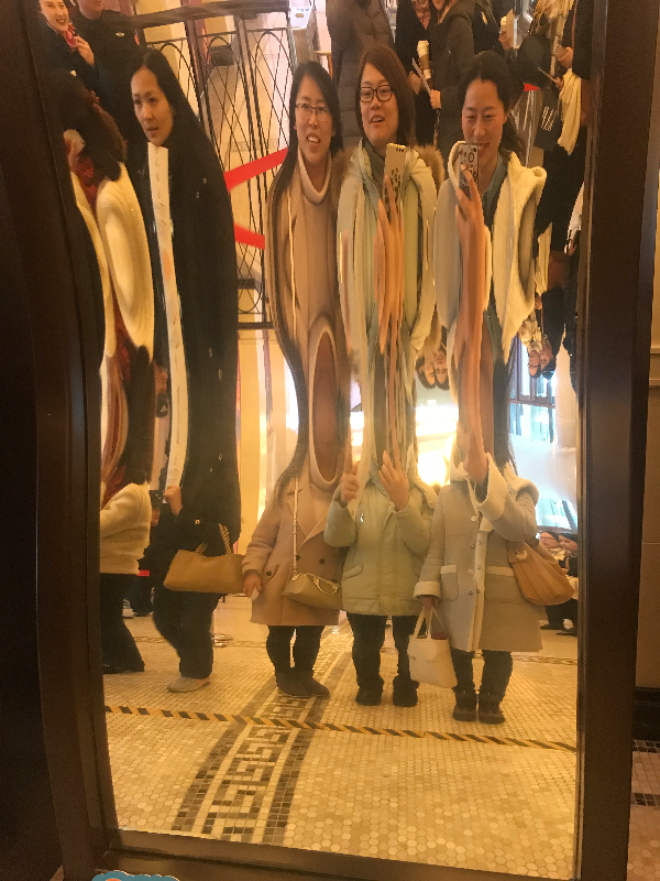 一进门,大家就被12面大镜子吸引了,大家排着队,依次有序地站在镜子前笑看自己变长、变矮、变胖、变瘦……仿佛又回到了小时候。